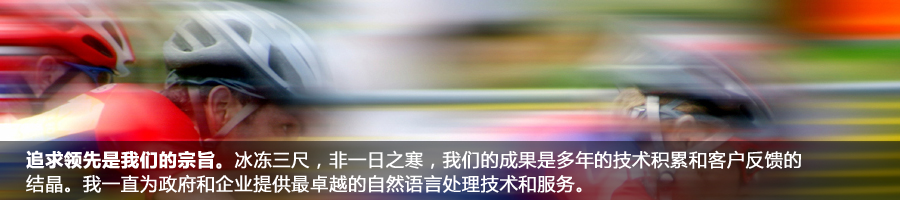 自從成立以來,我們?yōu)榭蛻籼峁└咝Ш椭悄芑男畔⑻幚砉ぞ吆妥稍兎?wù)。在這個信息爆炸的時代,如何讓互聯(lián)網(wǎng)上和企業(yè)內(nèi)部的海量信息為我們帶來更多的價值需要高度智能化的信息處理工具。我們提供的技術(shù)能夠高效并且準(zhǔn)確的對大量文本信息進(jìn)行處理、檢索、挖掘、翻譯等工作,并可方便地與信息系統(tǒng)的其他模塊進(jìn)行整合。